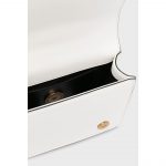 Crafted for the fashion-forward woman, the bag includes a single gold-toned metal top handle, adding a polished touch to its sleek silhouette. An adjustable and detachable fabric shoulder strap in an off-white or beige tone adds versatility—carry it by hand for evening chic or crossbody for daytime functionality.